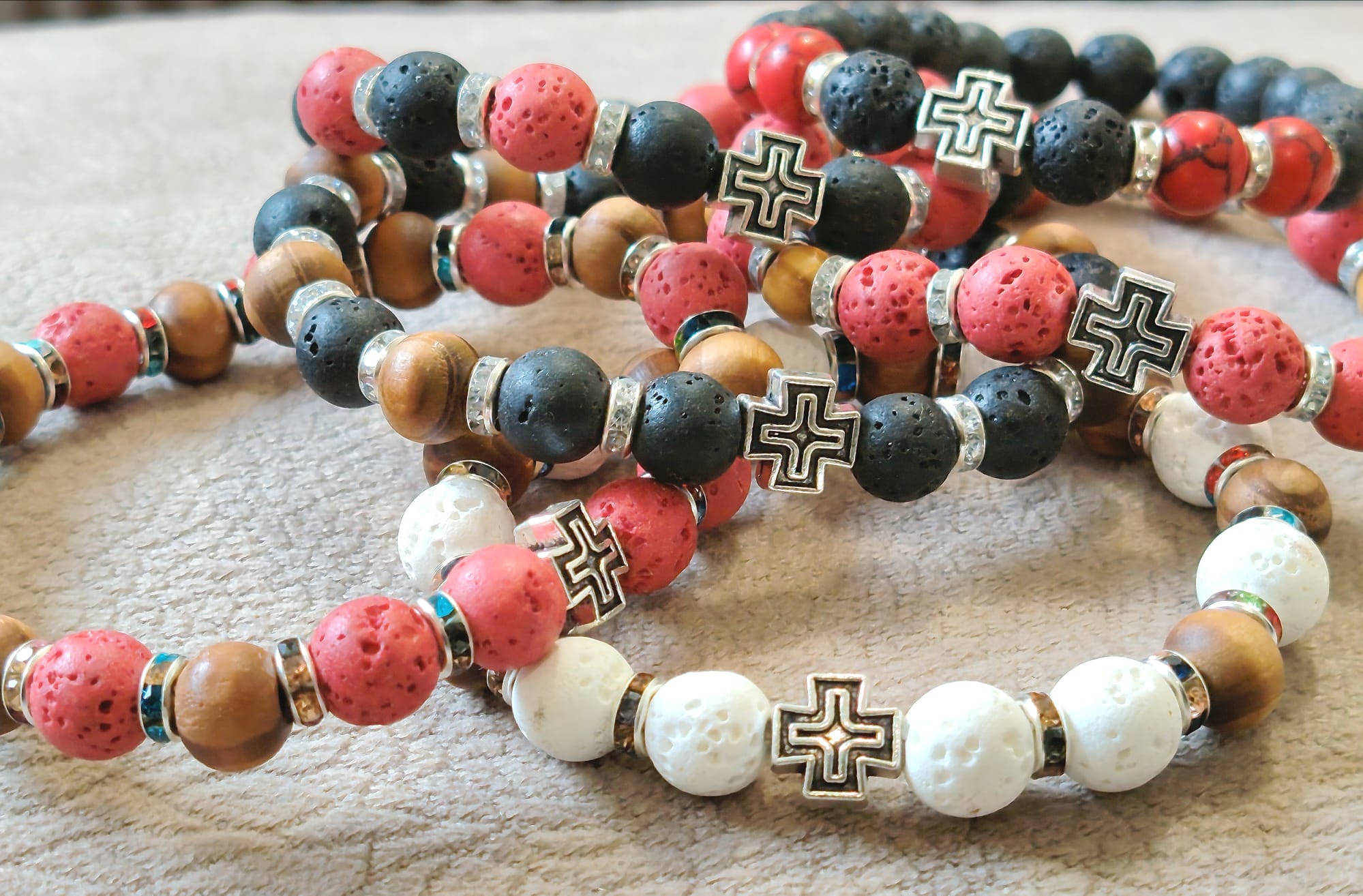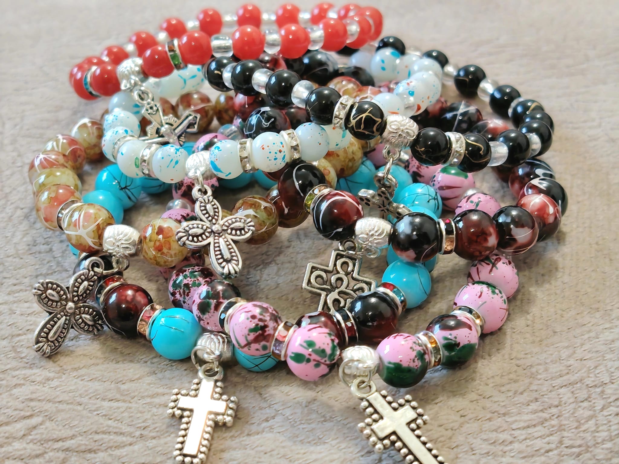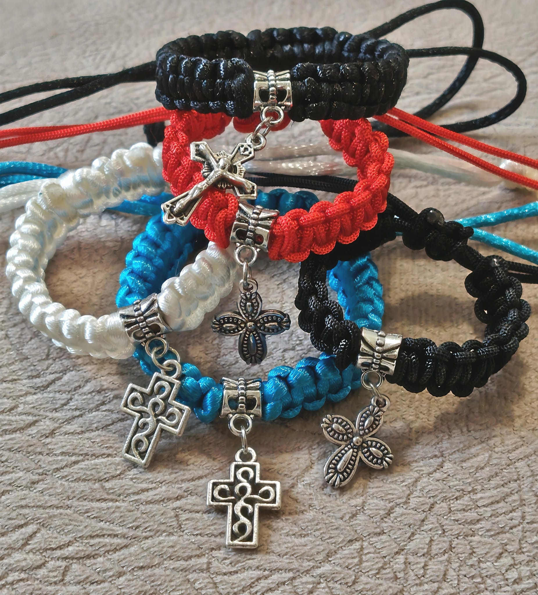 Наше наруквице израђене су од кристалних али и од дрвених и пластичних перли као и од перли камене лаве, пешчаних,каменчића итд , биране само од највећег квалитета. Радимо и плетене наруквице од шујташа од 2 мм, 1.5 мм и 1 мм.Наруквице правимо са металним Крстом као и са дрвеним Крстом, са медалјоном Иконе и разне друге.