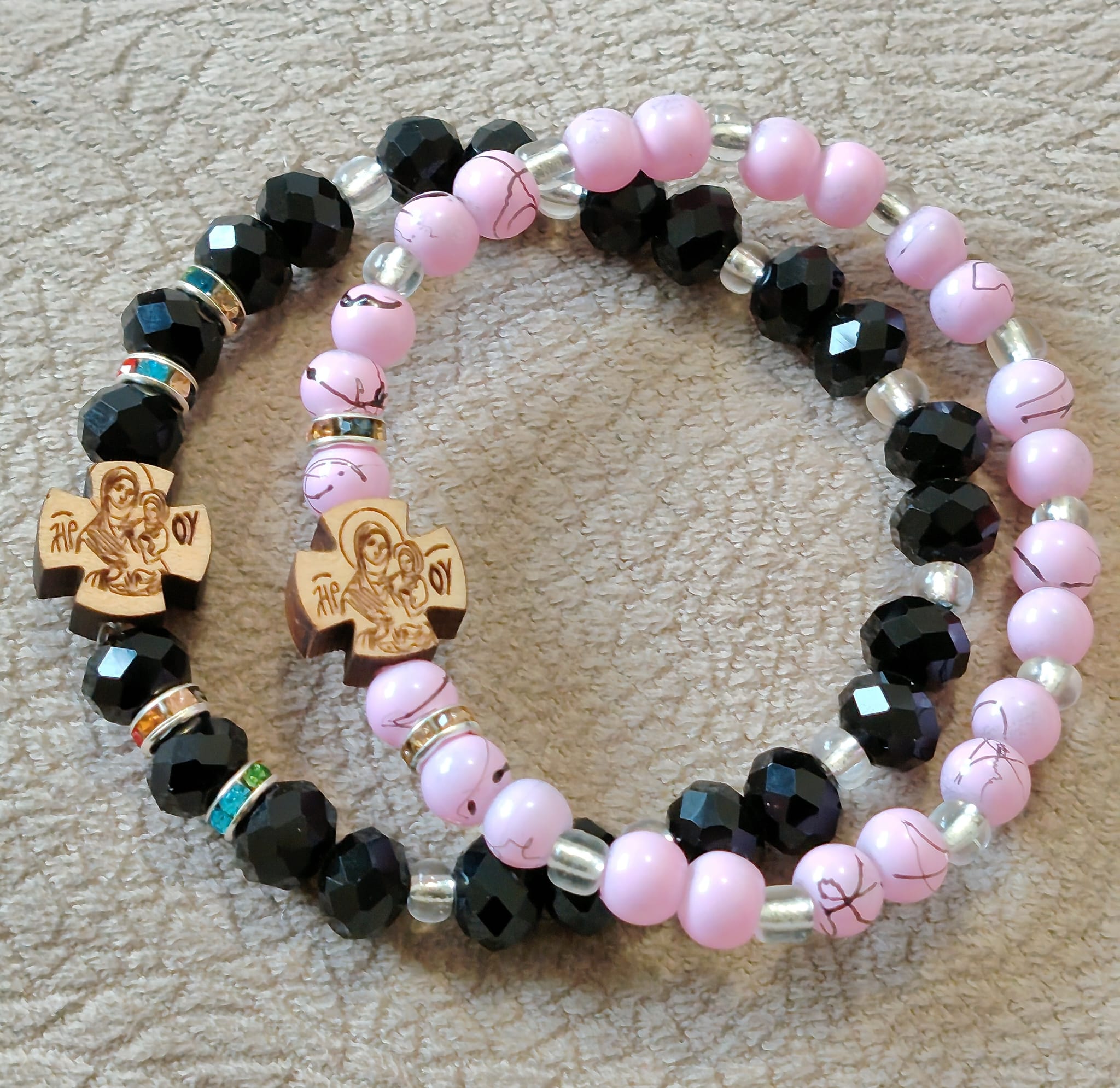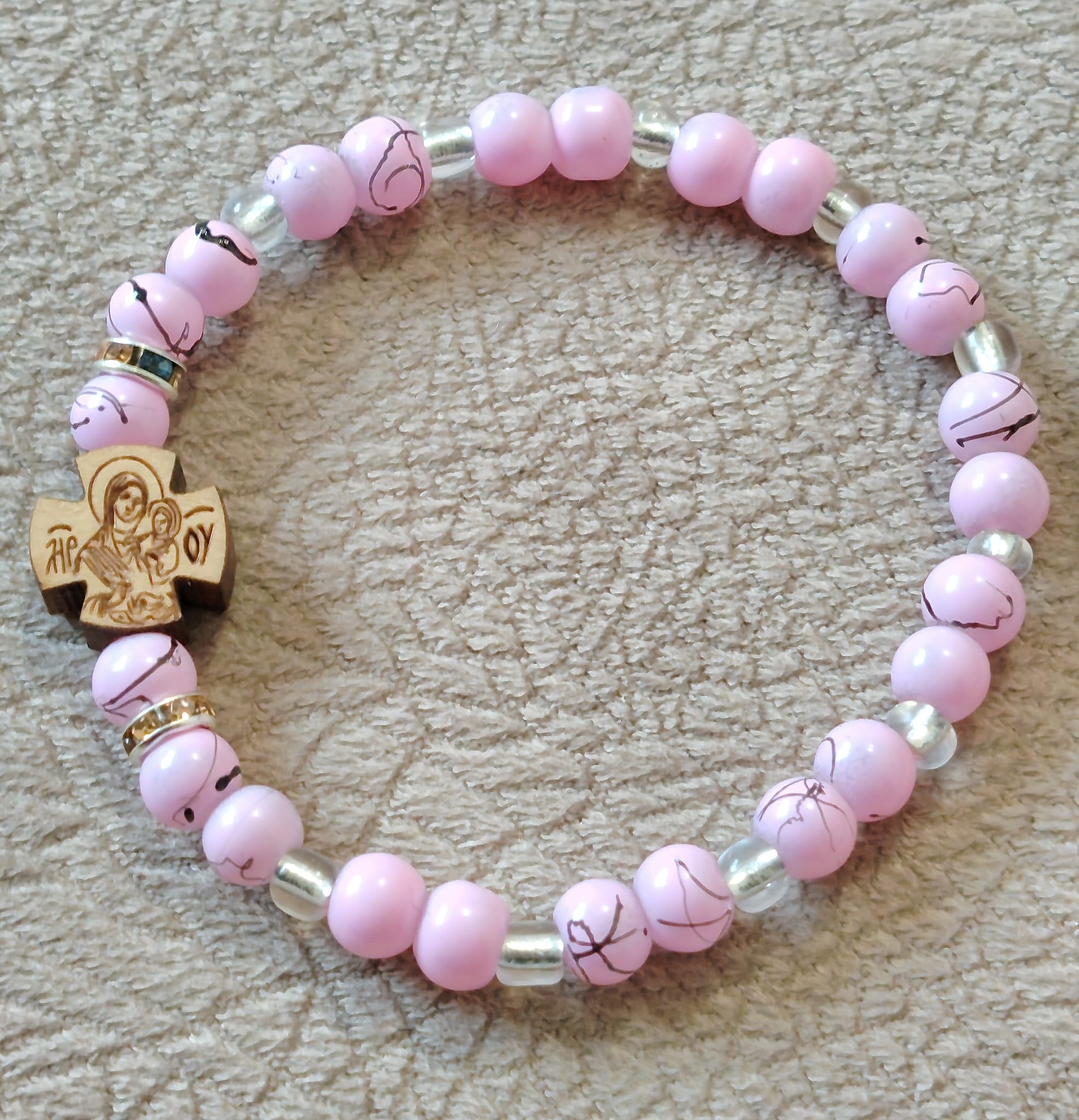 Плтена и нзана наруквица са дрвеним Крсто на којем је изгравирана Богородица. Плетена од канапа шујташ 2 мм, 1,5мм и 1 мм а низане од перли 8 мм , 6 мм, 4 мм
