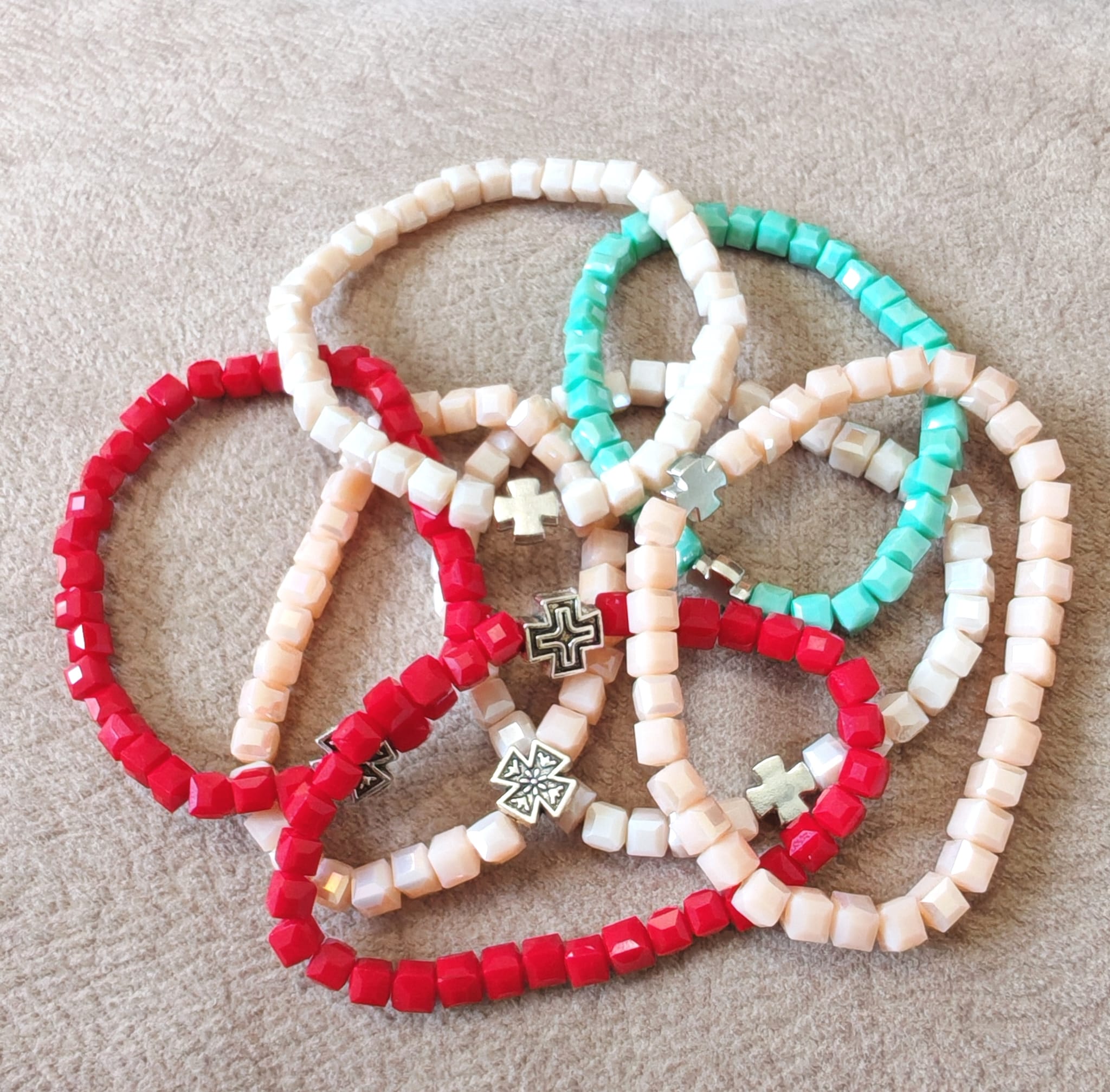 Наше наруквице израђене су од кристалних али и од дрвених и пластичних перли као и од перли камене лаве, пешчаних,каменчића итд , биране само од највећег квалитета. Радимо и плетене наруквице од шујташа од 2 мм, 1.5 мм и 1 мм.Наруквице правимо са металним Крстом као и са дрвеним Крстом, са медалјоном Иконе и разне друге.